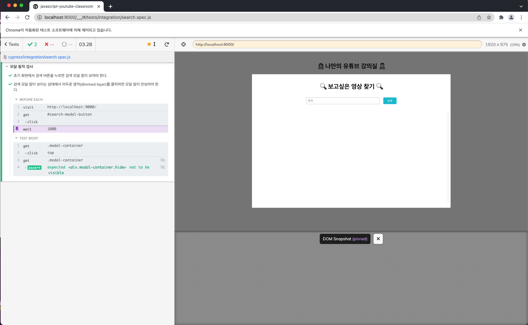 - viewport의 크기를 조절하지 않으면 모달의 dimmed 영역이 보이지 않아, 테스트가 원활하게 진행되지 않는다.