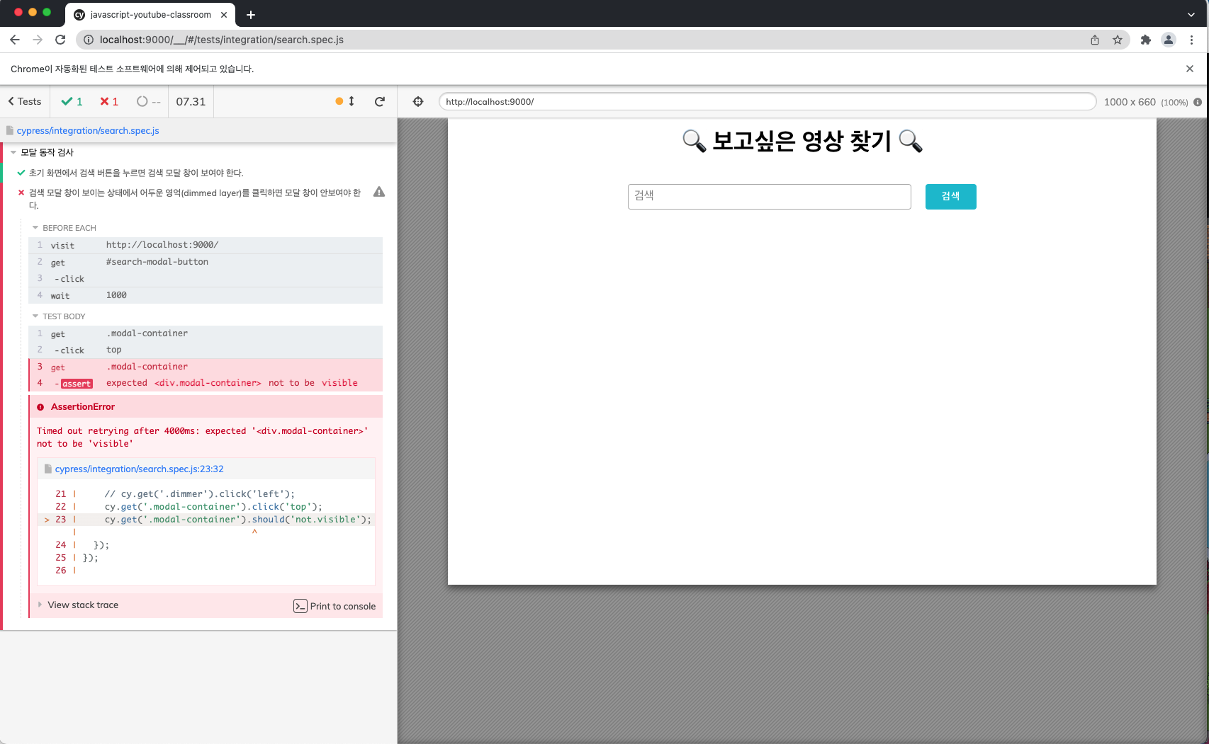 - viewport의 크기를 조절하지 않으면 모달의 dimmed 영역이 보이지 않아, 테스트가 원활하게 진행되지 않는다.