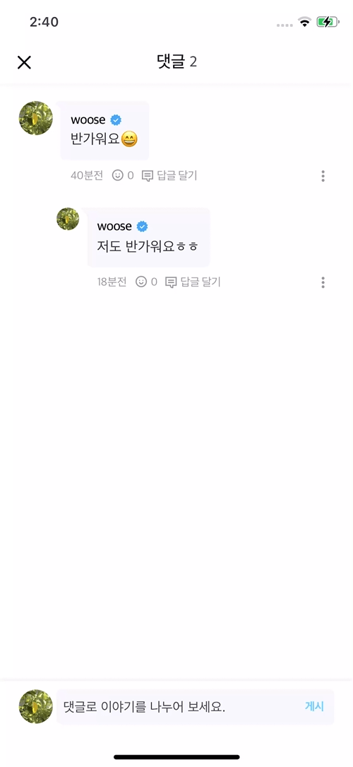 말풍선 하단 '답글 달기' 버튼을 누르면 답글이 달리는 댓글의 말풍선 색이 변하며 답글을 달 수 있는 상태로 변하게 됩니다.