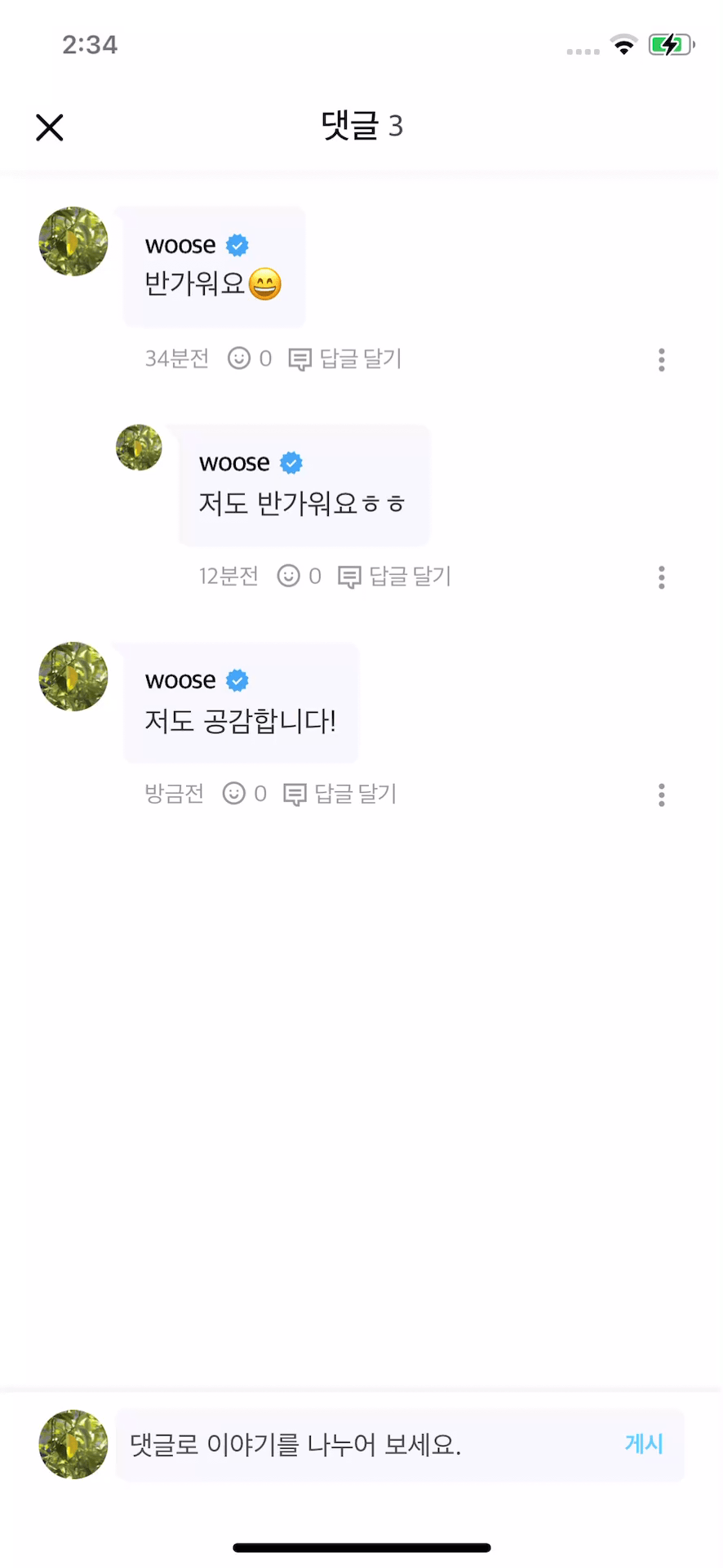 게시글에 대해 하고 싶은 이야기를 텍스트 입력창에 내용을 입력하고 '게시' 버튼을 누르면 댓글 작성이 완료됩니다.