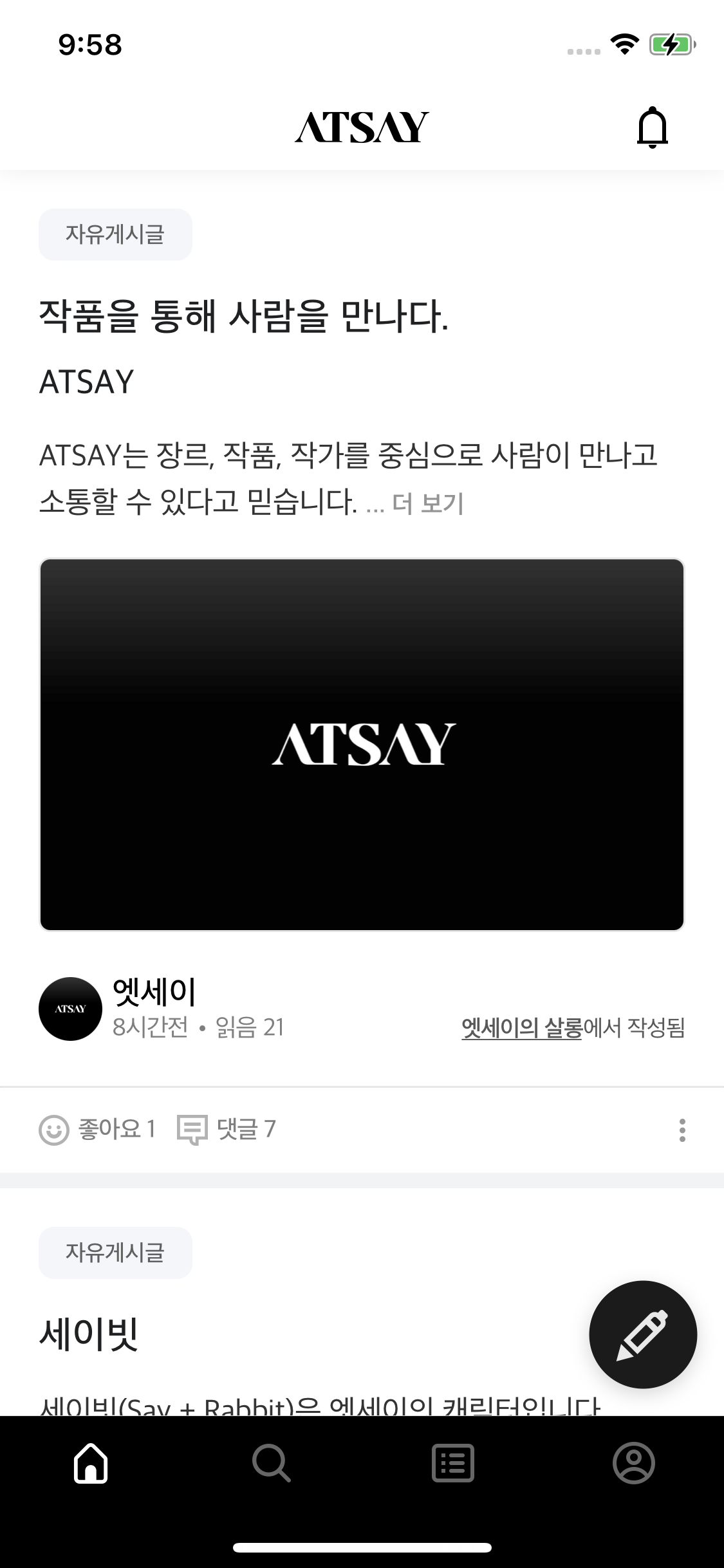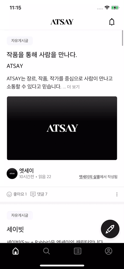 홈 화면에서는 유저가 작성한 게시글이 피드 형식으로 보입니다.
