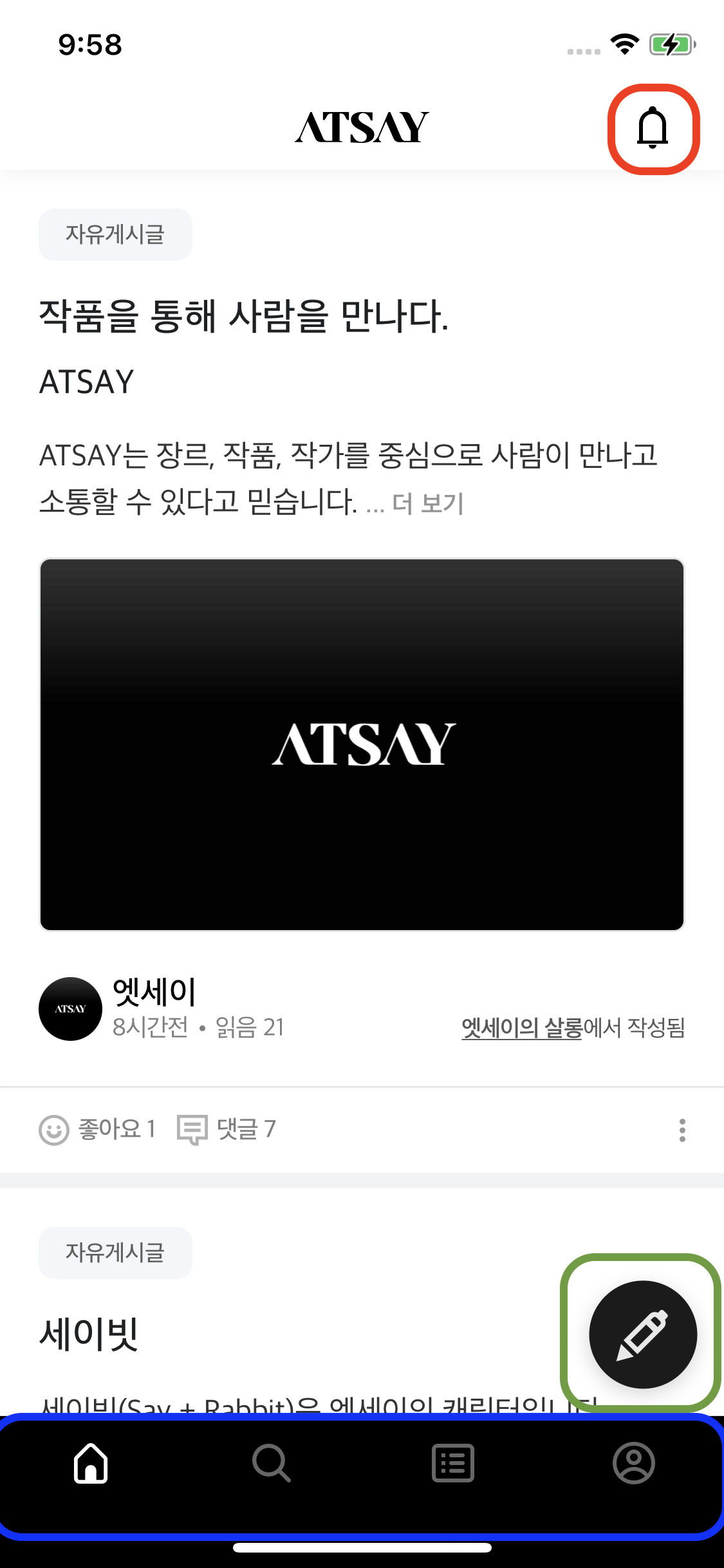 홈 화면 안에서는 각 버튼을 터치 시 게시글 작성(녹색 박스), 알림 목록 화면(빨간색 박스)으로 이동할 수 있는 기능이 구현됐습니다.