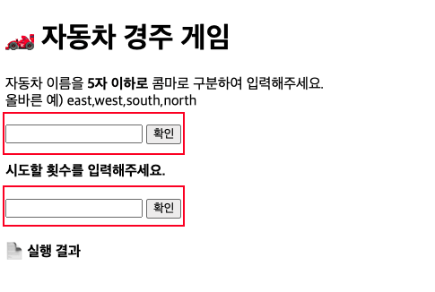 그리고 레이싱을 시도할 횟수를 입력하고 확인 버튼을 누르면 레이싱 실행결과와 최종 우승자를 출력하는 자동차 경주 게임을 구현하는 것이 2주차 미션이었습니다.